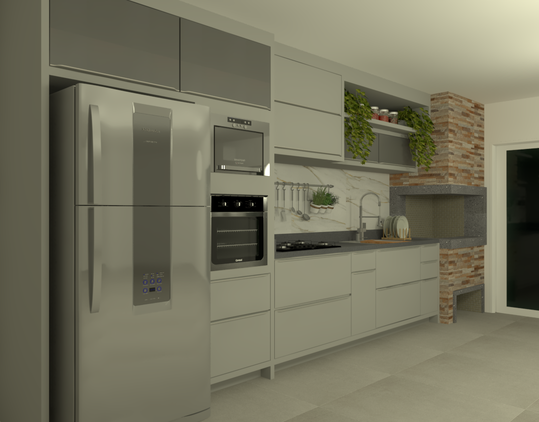 Cozinha com churrasqueira em tons claros, criando um ambiente suave e aconchegante.